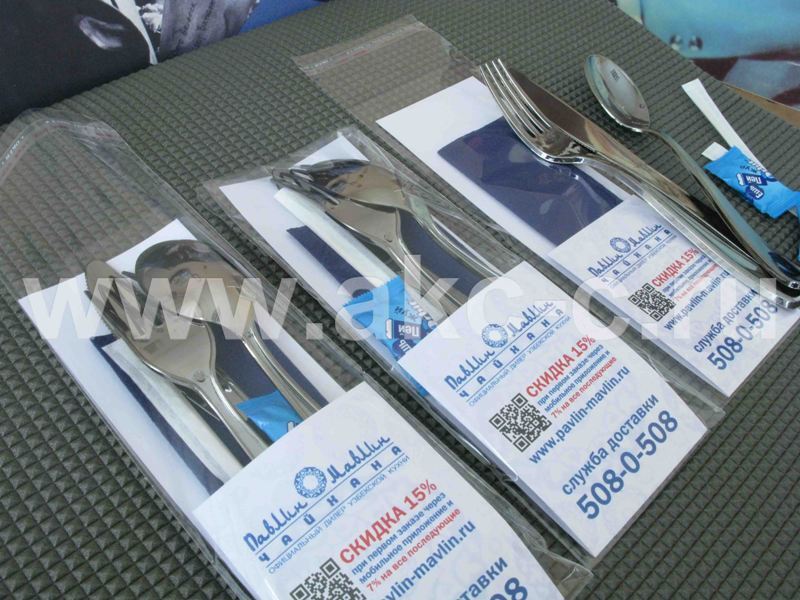 Бумажный конверт для приборов может стать не только удобным и красивым предметом сервировки, но и необычным и привлекательным рекламным носителем. На конверте можно разместить ваш логотип, QR-код со ссылкой на ваш сайт или меню и другие надписи.